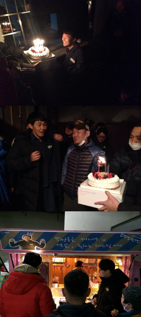 박성웅은 "추운 겨울 함께 고생하는 현장의 배우 및 스태프등 많은 분들로부터 축하를 받아 정말 기쁘다. 영화 촬영이 갑자기 중단돼서 뒤돌아보니 갑자기 생일케이크가 등장해 깜짝 놀랐다. 초를 불며 '황제를 위하여' 대박을 기원했다"고 전했다.
