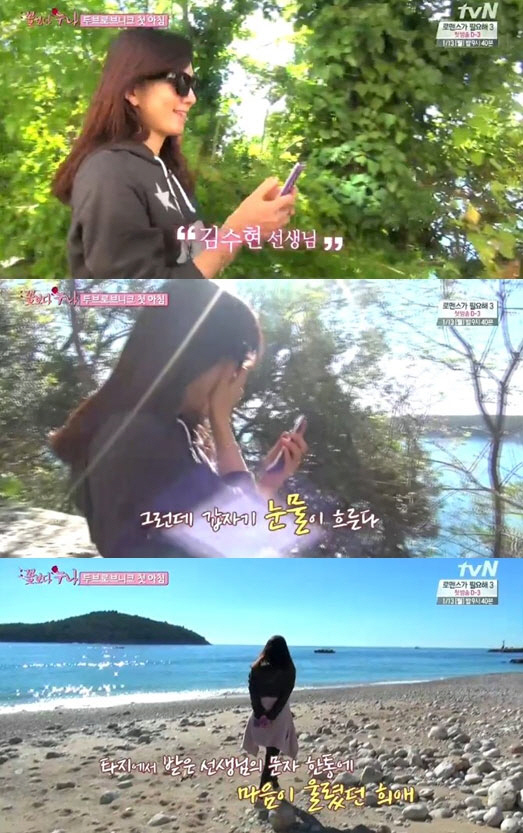 잠시 후 김희애는 "여행을 하다 보면 순간순간 힘들잖아요. 그때 마침 선생님이 문자로 '약을 좀 먹어라. 잠을 좀 많이 자야 한다'라고 하시더라. 내가 어제 잠을 못 잤는데 마치 나를 보고 있었다는 듯 한 느낌이 든다. 그런 것들이 나를 확 건드린 것 같다"라며 눈물을 흘린 이유를 밝혔다.