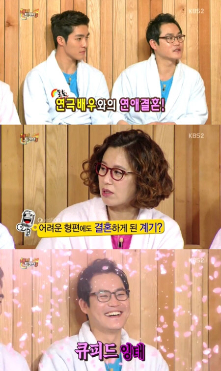 이에 MC 박미선은 "힘든 상황에서 어떻게 결혼할 생각을 했냐. 혹시 아이가 먼저 생긴 것이 아니냐"고 날카로운 질문을 했다. 이에 김성균은 "네"라고 인정하며 속도위반 결혼 사실을 고백했다.