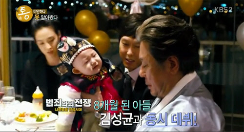 김성균은 지난 9일 방송된 KBS 2TV '해피투게더3'에서 영화 '범죄와의 전쟁' 속 돌잔치 장면에 자신의 아들이 출연했다고 밝혔다.