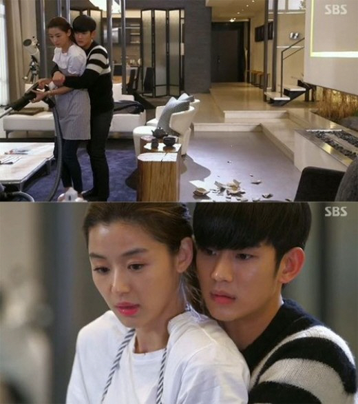 이날 방송에는 목숨의 위협을 받은 천송이(전지현)와 도민준(김수현)이 다시 동거하는 모습이 담겼다. 천송이는 신세지는 것이 미안해서 설거지를 하겠다고 말했다. 하지만 천송이는 좋은 그릇들을 깨버렸다.