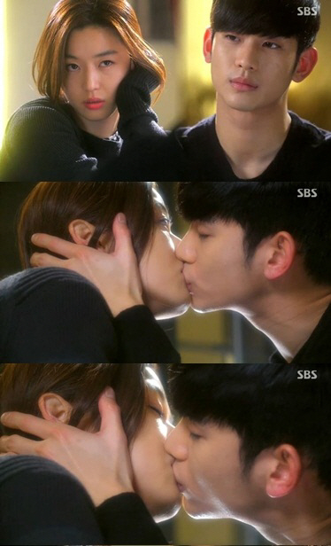 이날 방송에서는 도민준(김수현 분)과 천송이(전지현 분)의 키스신이 공개됐다. 천송이는 "내 별명이 15초의 요정이다. 광고 15초로 사람들 다 사로잡는다. 15초만 줘봐라"라며 도민준을 유혹했다. 천송이의 눈빛 유혹에 평소 천송이에게 감정이 있었던 도민준은 15초를 다 채우기도 전에 천송이에게 돌진했다.