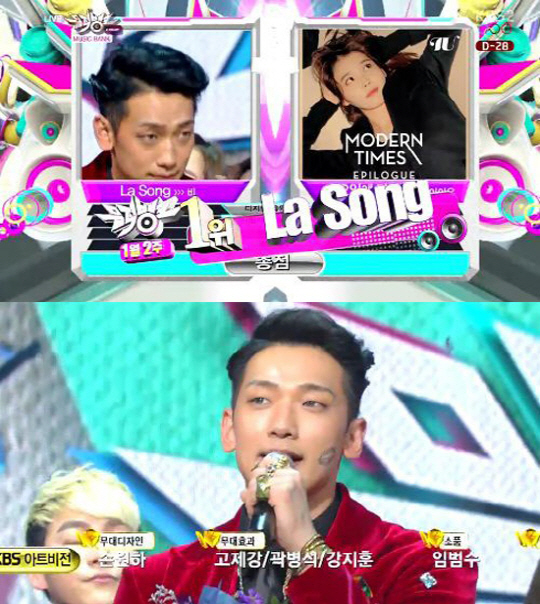 10일 방송된 KBS 2TV 음악프로그램 '뮤직뱅크'에 출연한 비는 1위 후보에 같이 오른 아이유를 꺾고, 최종 점수 집계 결과 1위 수상의 영광을 차지했다.
