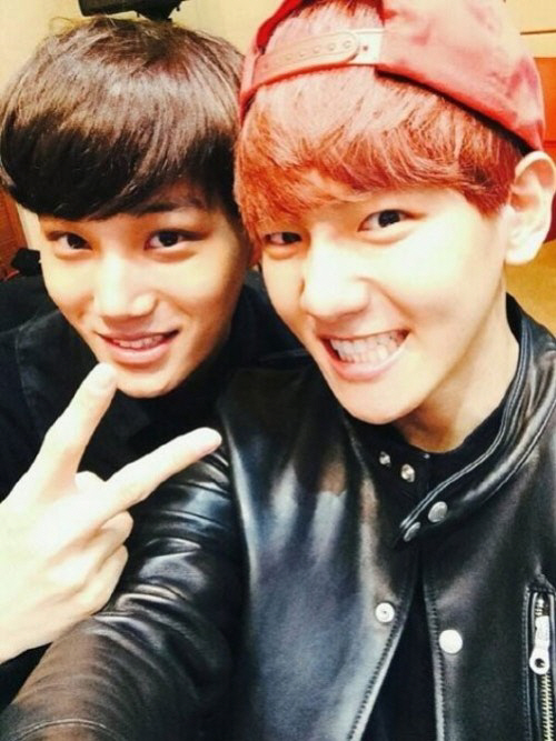 공개된 사진 속에는 카이와 백현이 다정하게 어깨를 맞댄 채 인증샷 촬영에 여념이 없는 모습이다.