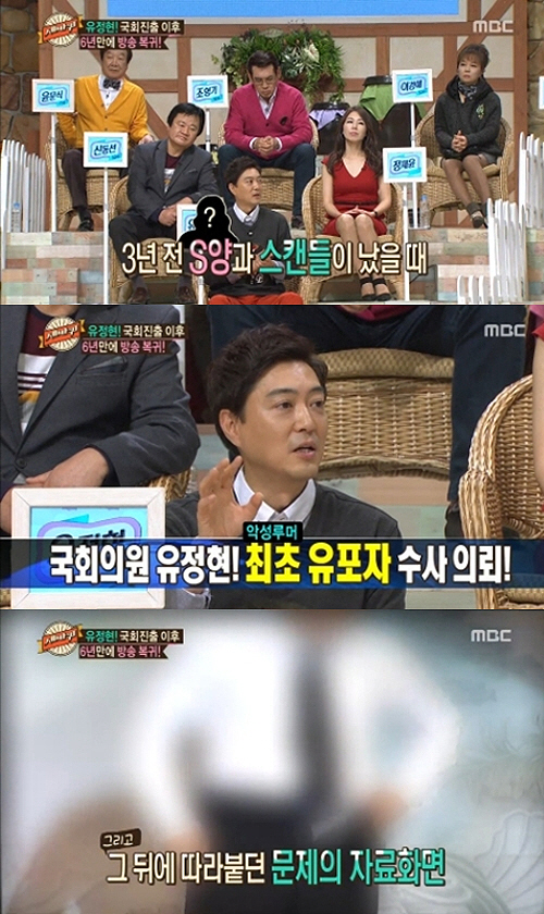 이날 유정현은 "난 MBC에 감정이 안 좋다. 3년 전 스캔들이 났을 때 다른 방송사들은 간단히 보도했는데 MBC는 '섹션TV 연예통신'에서 메인으로 보도했다"며 서운한 감정을 드러냈다.