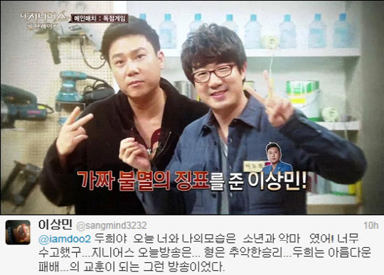 또한 이상민은 탈락 소감을 남긴 이두희에게도 사과의 말을 전했다. "두희야 오늘 너와 나의 모습은 소년과 악마 였어! 너무 수고했고 지니어스 오늘 방송은 형은 추악한 승리 두희는 아름다운패배의 교훈이 되는 그런 방송이었다"는 글을 남겨 눈길을 끌었다.