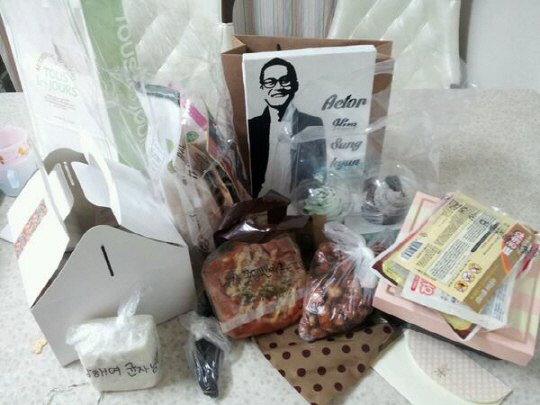 사진은 김성균이 팬들에게 받은 선물을 모아 촬영한 것으로 편지, 컵케이크, 떡 등을 포함한 다양한 것들이 담겨 있다.