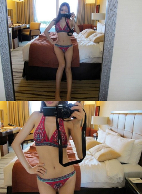 공개된 사진 속에는 박현선이 빨간색 바탕의 다소 특이한 무늬가 그려진 비키니를 입고 거울에 비친 자신의 모습을 카메라에 담기에 여념이 없는 모습이다.