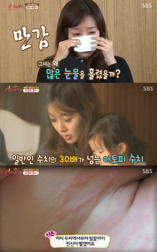 이은은 13일 방송된 SBS '오! 마이 베이비'를 통해 8년의 공백을 깨고 방송에 복귀했다. 그는 "딸 셋이 다 아토피가 너무 심했다. 만질 수도 없을 정도였다. 너무 힘들었다"고 말했다.