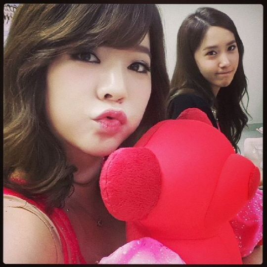 사진에서 써니는 빨간색 곰인형을 끌어안고 입술을 쭉 내민 채 귀여운 표정을 짓고 있는 모습. 써니의 뒤에는 최근 이승기와 열애를 인정한 윤아가 한껏 더 물오른 미모를 뽐내며 카메라를 응시하고 있어 눈길을 끈다.