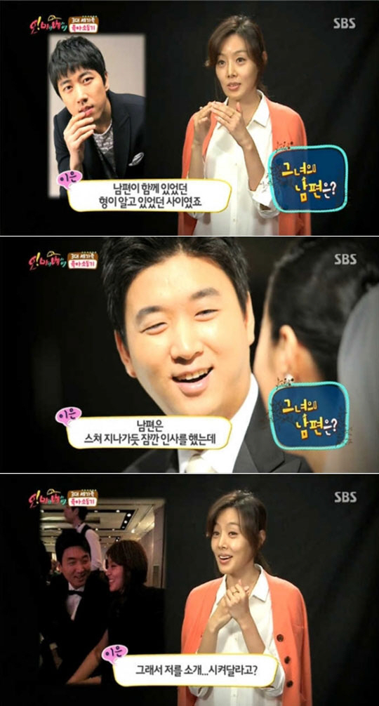 이은은 "남편과 스쳐 지나가듯 잠깐 인사를 나눴다"며 남편과의 첫 만남을 회고했다. 이어 그는 "알고 봤더니 내 지인과 남편의 지인 장수원이 알고 지내는 사이였다"며 "남편이 장수원을 통해 나를 소개시켜 달라고 했다"고 남편과 인연을 맺게 된 계기를 밝혔다.