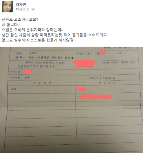 김가연은 13일 자신의 페이스북을 통해 온라인 커뮤니티 디시인사이드 tvN '더 지니어스' 갤러리에 악성댓글을 남긴 악플러 21명을 고소했다고 밝혔다.