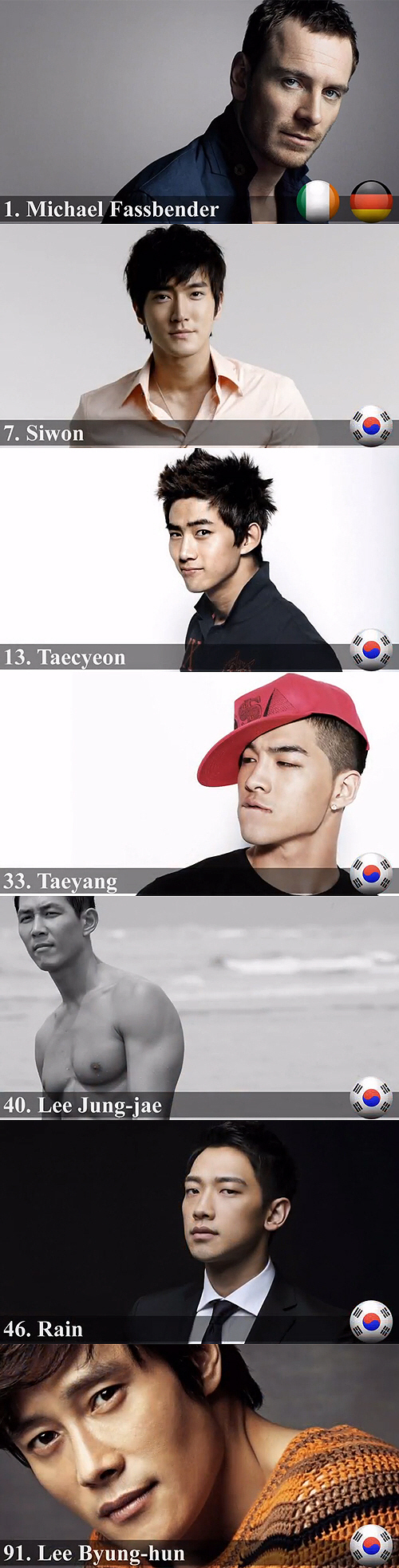 슈퍼주니어 최시원, 배우 이병헌 이정재, 가수 비, 2PM 택연, 빅뱅 태양이 '세계에서 가장 잘생긴 얼굴 100인'에 이름을 올렸다.
