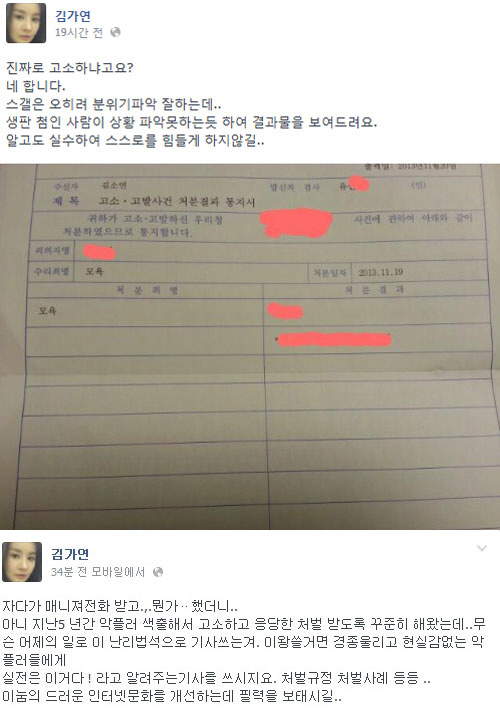 14일 김가연은 자신의 페이스북에 "자다가 매니저 전화 받고, 뭔가 했더니…. 지난 5년간 악플러 색출해서 고소하고 응당한 처벌 받도록 꾸준히 해왔는데…. 무슨 어제의 일로 이 난리 법석으로 기사 쓰냐"며 "이왕 쓸 거면 경종 울리고 현실감 없는 악플러들에게 '실전은 이거다'라고 알려주는 기사를 쓰시지요. 처벌규정이나 처벌사례 등등. 이 더러운 인터넷 문화를 개선하는데 필력을 보태시길…"이라는 글로 악플러들을 고소한 심경을 밝혔다.