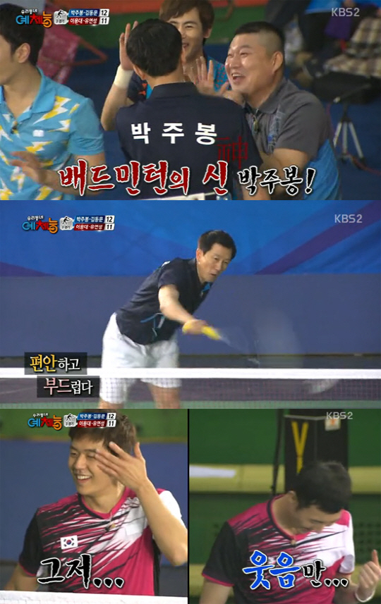 14일 밤 방송된 KBS 2TV 예능프로그램 '우리동네 예체능'에서는 '배드민턴 리턴즈-올스타 슈퍼매치' 두 번째 편으로 박주봉·김동문 조와 이용대·유연성 조의 배드민턴 복식 경기가 열렸다.