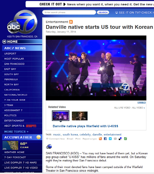 미국 주요 언론인 ABC7 뉴스는 지난 11일 'Danville native starts US tour with Korean band U-KISS'라는 제목으로 샌프란시스코에서 펼쳐친 유키스 단독 콘서트를 자세히 보도했다.