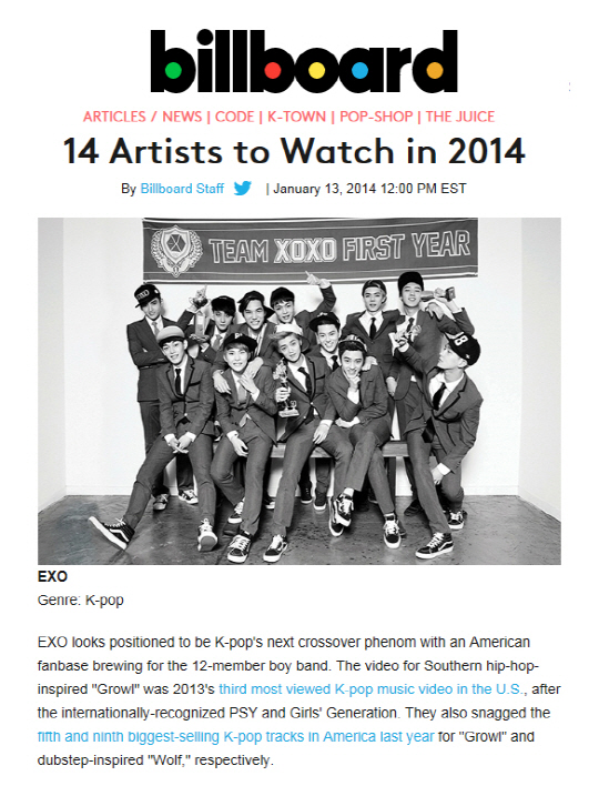 엑소가 미국 빌보드 선정 '2014 주목할 아티스트 14'에 이름을 올렸다.