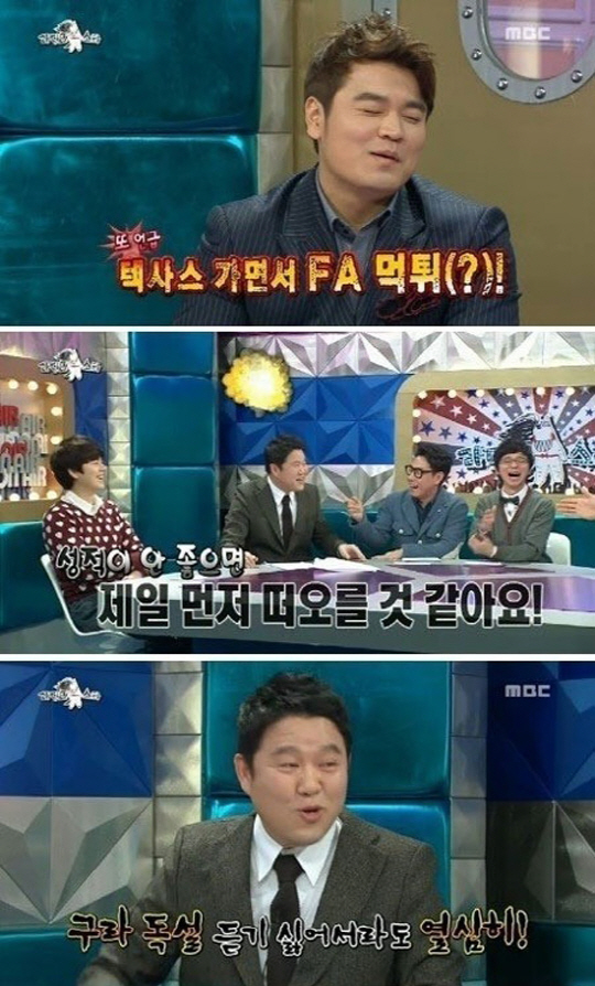 이날 김구라는 'FA대박'으로 1억 달러의 사나이로 등극한 추신수에게 "박찬호가 텍사스와 6천만 달러에 계약했었는데 역대 '먹튀' 10위 안에 들었다"고 말해 추신수를 당황케 했다.