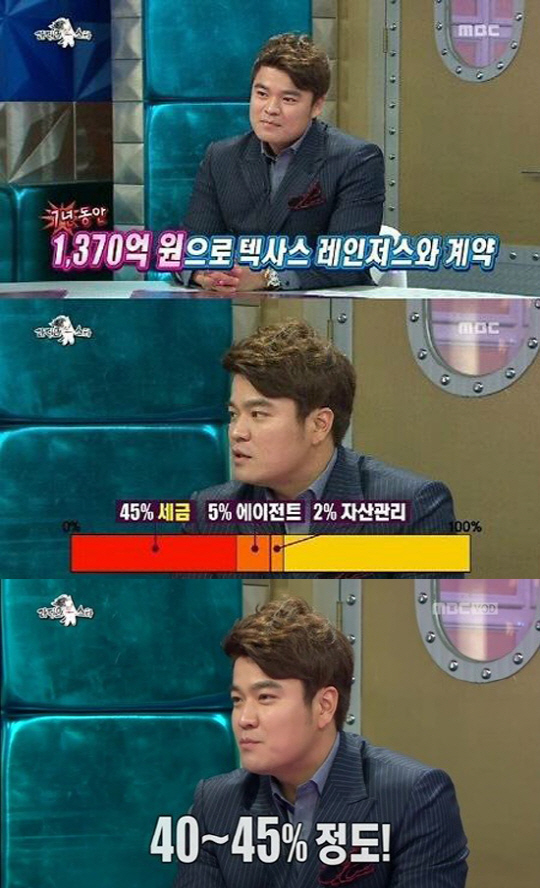 이에 추신수는 "미국에서는 세금을 45% 뗀다. 5%는 에이전트비로 나가고 2%는 자산관리사에게 준다. 결국 내가 가져가는 돈은 40~45% 정도"라고 설명했다.