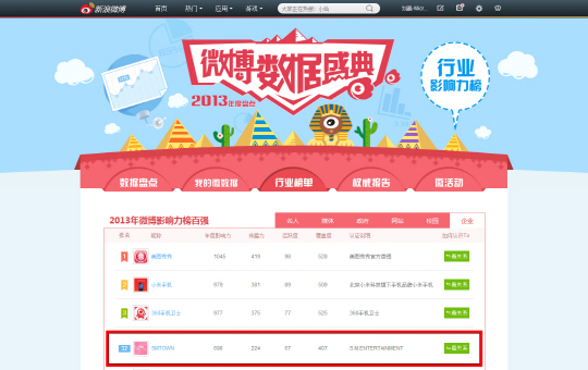 이번 '2013년 웨이보 통계수치성전'은 2012년 12월부터 2013년 11월까지 시나닷컴에서 운영하는 중국 최대 규모의 소셜네트워크서비스(SNS) 웨이보의 팬수를 비롯해 콘텐츠 게재수, 댓글수, 리트윗수 등의 데이터를 종합적으로 평가해 영향력 순위를 산정한 것이다. 한국 기업으로는 SM을 비롯해 삼성전자(37위), 북경현대자동차(72위), 삼성Apps(74위), 신라면세점(96위) 등 5개 회사가 이름을 올렸다.