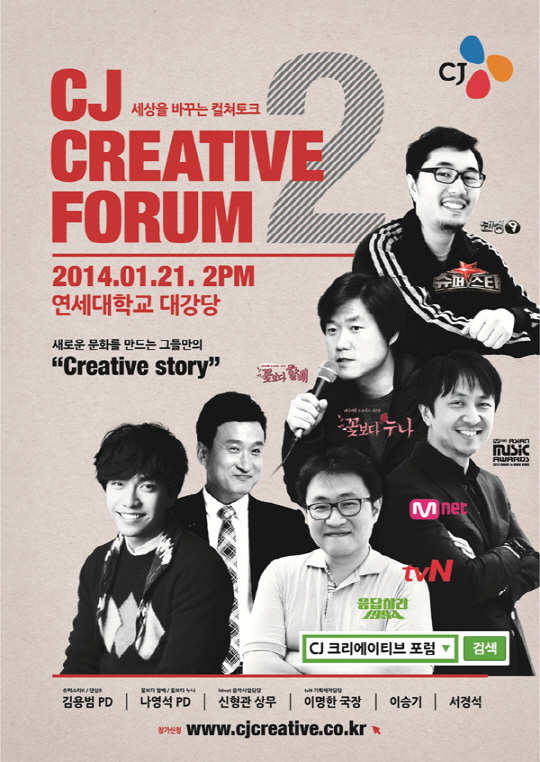 CJ 크리에이티브 포럼'은 문화계 파워 리더들을 초청, 그들의 창조적 사고와 성공 비결을 들어보고 창조경제 시대에 필요한 통찰력과 비전을 공유하기 위해 마련한 행사다. 이번이 그 두번째로, 김용범, 나영석, 신형관, 이명한 등(이름 가나다 순) CJ E&M을 대표하는 크리에이터 4인방이 참석해 '새로운 문화를 만드는 그들만의 크리에이티브 스토리'를 주제로 솔직 유쾌한 토크를 펼친다. 특히 연예계 대표 크리에이터로 손꼽히는 이승기와 서경석도 함께해 스타PD들과의 숨은 인연을 공개하는 등 더욱 흥미를 더할 예정이다.