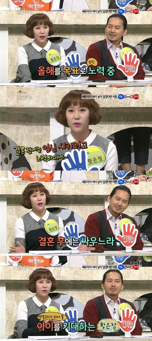 17일 오후 방송된 KBS 2TV '가족의 품격 풀하우스'에서 황은정은 윤기원과 함께 출연해 "자녀가 없는데 올해는 무조건 가지려고 노력 중"이라고 2세에 대한 소망을 밝혔다.