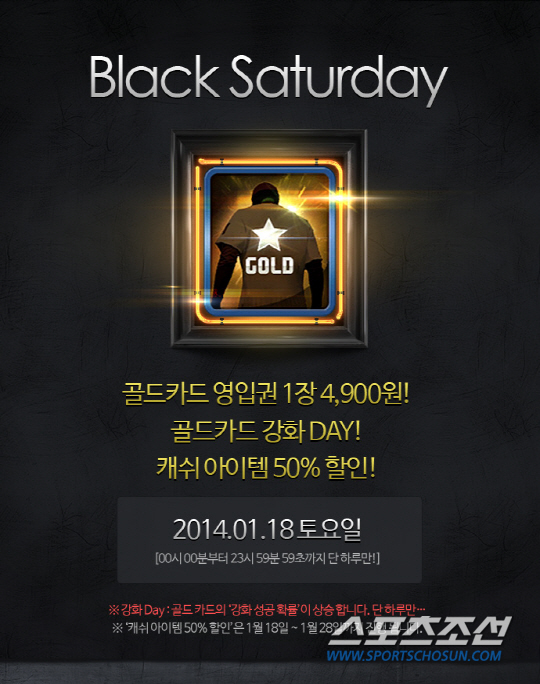 '블랙 새터데이'는 18일 자정부터 다음날 자정까지 단 하루 동안 열리는 할인 행사로, '골드카드 영입권'이 4900원에 판매된다. 이용자들에게 인기가 높은 '골드카드'는 9~10코스트 카드로 박병호, 이종범, 김시진 등 프로야구 최고 스타들이 등장한다. 특히 이번 '골드카드 영입권'은 '블랙 새터데이'에만 특별 판매되는 상품이다.