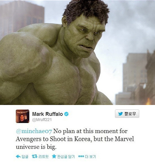 마크 러팔로는 지난 20일 한 네티즌이 한국에서 어벤져스 촬영 계획이 있는지 묻는 질문에 "아직까지 한국에서 '어벤져스'를 촬영한다는 계획은 없다"며 "하지만 마블의 세계는 거대하다"고 의미심장한 글을 남겨 관심을 모았다.