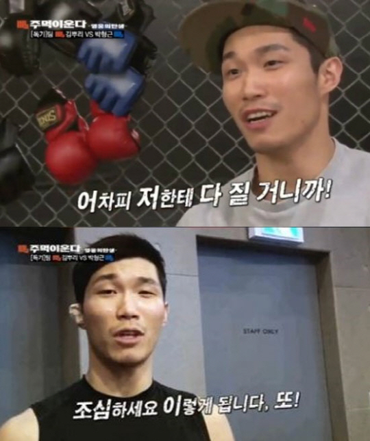 21일 방송된 XTM '주먹이 운다-영웅의 탄생'에서는 용기(서두원, 이훈), 광기(육진수, 뮤지), 독기(남의철, 윤형빈)로 나뉜 총 세 팀 가운데 최종 팀 선발을 위해 1대1 서바이벌 베틀이 벌어졌다.