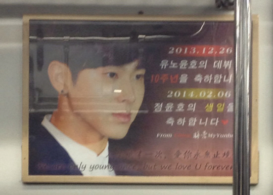동방신기는 지난해 12월 26일 데뷔 10주년을 맞았으며, 정윤호는 2월 6일 생일을 맞이한다. 이에 정윤호 팬들이 지하철 광고로 축하 메시지를 전하며 뜨거운 '팬심'을 자랑했다.