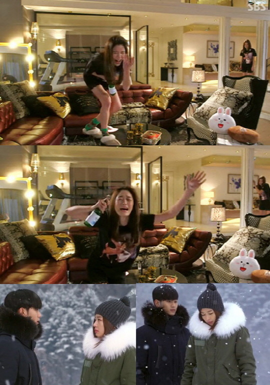 이날 천송이는 술을 잔뜩 마시고 취해 소주병을 마이크 삼아 백지영의 '총 맞은 것처럼'을 열창했다. 특히 '별그대'에서 완벽히 망가지는 모습을 선보인 전지현은 이번에도 마스카라가 다 번진 채 웃다가 울고, 오열하며 '도민준'이름을 외치는 등 엽기적인 모습으로 웃음을 자아냈다.