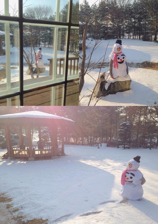 공개된 사진 속에는 눈이 쌓인 벌판에서 눈사람 옷을 입고 눈사람으로 변신한 사유리의 모습이 담겨있다.