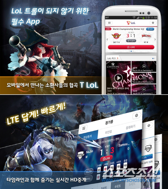 'T LoL' 앱은 전세계적으로 큰 인기를 끌고 있는 '리그 오브 레전드' 생중계와 더불어 경기 정보를 모바일로 볼 수 있는 서비스로 시간과 장소에 구애 받지 않고 시청 가능한 것이 가장 큰 특징이다. 더불어 다른 중계 서비스와 비교해 초고화질의 영상을 제공해 게임 속 작은 아이템까지 생생하게 관람이 가능하다. 이 서비스는 LTE 스마트폰을 쓰고 있는 SK텔레콤 유저라면 누구나 별도 가입이나 비용 없이 T스토어에서 무료로 다운받을 수 있다.