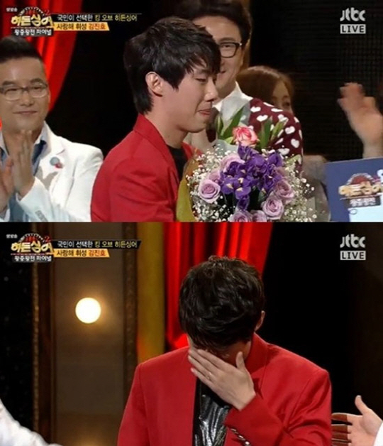 우승을 차지 한 김진호는 "15살부터 10년 동안 집안에 있는 화장실 거울을 보면서 언제까지 이렇게 음악을 해야 하나 생각했는데 나를 이렇게 세상으로 끌어내준 '히든싱어' 작가에게 감사하다"고 고마움을 표시했다.