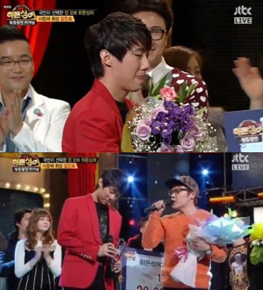 이에 국민 문자 투표 총 86만 4868표 중 36만 9374표로 42.7%의 득표율로 우승을 차지한 김진호는 "15살부터 10년 동안 집안에 있는 화장실 거울을 보면서 언제까지 이렇게 음악을 해야 하나 생각했는데 나를 이렇게 세상으로 끌어내준 '히든싱어' 작가에게 감사하다"고 소감을 전했다.