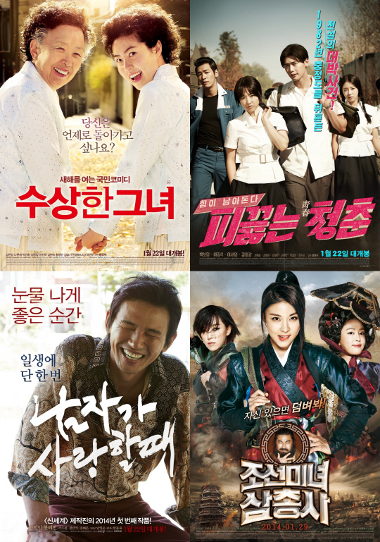 지난 22일 동시에 개봉한 '수상한 그녀'와 '피끓는 청춘' '남자가 사랑할때'가 극장가을 동시에 공략하며 관객들에게 '골라 보는 재미'를 주고 있는 것. 사실 초반 승기는 '피끓는 청춘'이 잡는 듯했다. '피끓는 청춘'은 개봉 첫날 15만 2346명(이하 영진위 영화관 입장권 통합전산망)을 기록하며 14만 2604명을 모은 '수상한 그녀'와 9만 8542명을 동원한 '남자가 사랑할때'를 앞섰다.