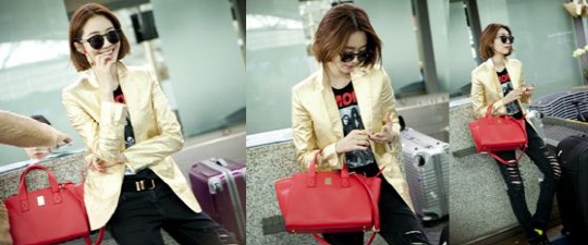 평소 스타일리시한 공항패션을 선보이기로 유명한 고준희는 이 날도 역시 강렬한 골드 컬러 재킷에 프린트 티셔츠를 입고 쿠론 레드 다인백으로 포인트를 주어 화사하면서도 세련된 스타일을 연출했다.