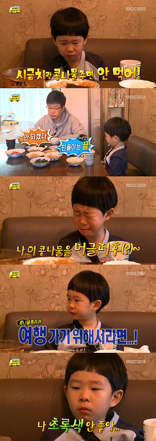 이날 김성주는 식사 중 김민율의 그릇에 시금치와 콩나물을 올렸다. 이를 본 김민율은 "시금치랑 콩나물 주면 밥 안 먹어"라며 울먹거리며 반찬 투정을 했다.