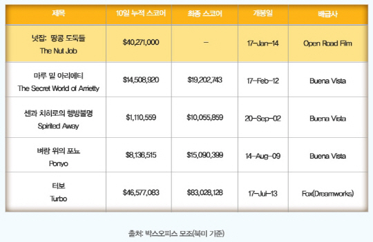 한국영화 사상 최고의 북미 흥행 기록을 연일 경신 중인 영화 '넛잡: 땅콩 도둑들'은 북미 개봉 열흘 만에 4,027만 달러의 놀라운 흥행성적을 기록 중인데 이는 일본을 넘어 세계로 진출한 지브리 스튜디오의 북미 최고 흥행작 '마루 밑 아리에티'의 10일차 누적 스코어인 1,450만 달러는 물론 '센과 치히로의 행방불명'의 111만 달러, '벼랑 위의 포뇨'의 813만 달러의 수익을 월등히 넘어서는 기록이다.