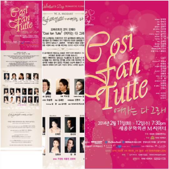 로맨틱 코미디 오페라 'Cosi fan Tutte'(코지 판 투떼)가 발렌타인데이를 맞아 2월 11일, 12일 오후 7시30분 세종 문화회관 엠 시어터에서 이틀간 공연된다. 이번 공연은 천재 작곡가 모차르트와 환상의 콤비 '로렌초 다 폰테'가 합작하여 만든 걸작. 모짜르트 오페라 중 가장 여성적이고 관능적인 음악으로 꼽힌다. 천재 작가 로렌초 다 폰테는 유부녀와의 연애사건으로 베네치아에서 추방 당해 빈으로 온 뒤 모차르트 최고 걸작 이탈리아어 오페라 세 편을 썼다. 1786년에 빈에서 초연한 '피가로의 결혼', 1787년에 프라하에서 초연한 '돈 조반니', 그리고 1790년 1월 26일 빈 부르크테아터에서 공연된 '코지 판 투테'다. 그 유명한 3편 중 한편이 이틀간 세종문화회관 무대에 올려지는 것이다.