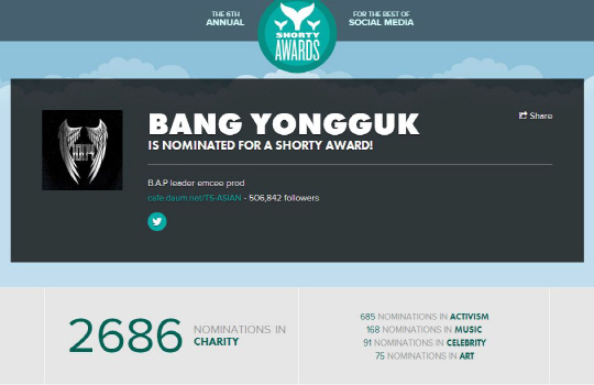 B.A.P의 소속사인 TS 엔터테인먼트는 방용국이 올해로 제 6회를 맞이하는 '쇼티 어워즈(Shorty Awards)'의 '자선활동(CHARITY)' 부분에 후보로 올랐다는 소식을 전했다. '쇼티 어워즈'는 SNS 활용에 있어서 각 분야에서 두각을 나타내는 인물과 산업체를 선정하여 시상하는 시상식으로, 올해도 '엔터테인먼트'부터 '테크&이노베이션', '글로벌 이슈'에 이르기까지 다양한 분야에 걸쳐 시상이 진행된다.