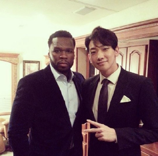 사진 속 비와 50센트는 깔끔하게 블랙 슈트를 차려입은 모습. 강렬한 포스를 발산하는 50센트와 은은한 미소와 함께 손으로 브이(V)를 그리는 비의 모습이 눈길을 끈다.