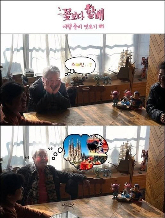 28일 tvN '꽃보다할배' 공식 홈페이지에는 '꽃보다 여행 준비 엿보기. 스페인 생각에 방긋방긋 H1'이라는 글과 함께 한 장의 사진이 공개됐다.