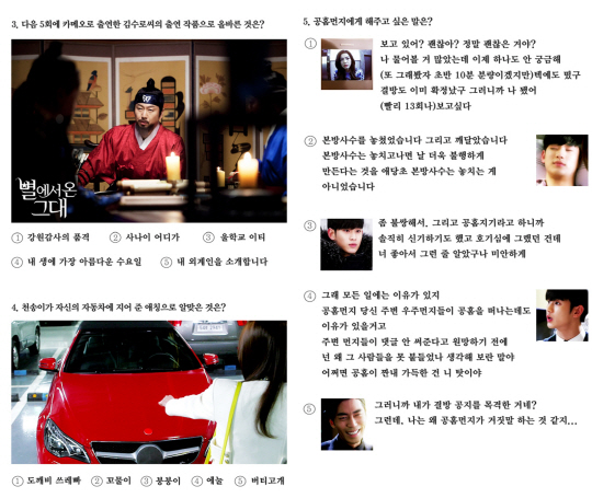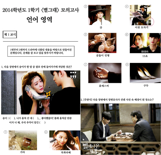 '별에서 온 그대' 홈페이지(http://tv.sbs.co.kr/lovefromstar)에는 '재미로 푸는 2014학년도 1학기 '별그대' 모의고사'라는 제목과 함께 전지현과 김수현, 그리고, 신성록, 김창완, 그리고 카메오로 출연한 김수로가 등장한 언어영역 문제가 공개되었다.