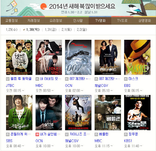 또 설 당일인 31일에는 '포화 속으로', '광해, 왕이 된 남자', '007 카지노로얄', '늑대소년', '7번방의 선물' 등이 방송 예정이고, 2월 1일에는 '바람과 함께 사라지다', '스타워즈 시리즈', '어벤져스', '도둑들' 등이 방송 예정이여서 시청자들과 네티즌들의 눈길을 사로잡고 있다.