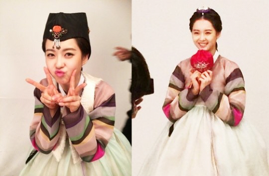 한복을 차려 입고 양손으로 브이(V) 자를 그리며 깜찍한 포즈를 취하고 있는 사진과, 빨간색 복주머니를 들고 여신 자태를 과시하고 있는 사진이다.