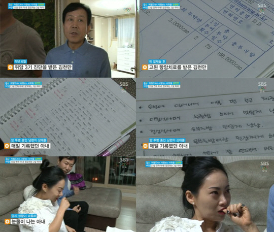 고된 항암 치료를 받은 김천만 곁에 자리를 지킨 아내 한영애씨는 "항암 1차 때 설사를 몇 번하고 몇 시에 약을 먹고 그런 것을 일일이 다 적었다"며 김천만의 암 투병 당시의 상태를 매일 기록한 노트를 공개하며 남편에 대한 사랑을 보여줬다.