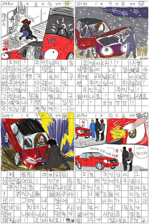 이 게시물에는 '은빛토깽'이라는 닉네임의 네티즌이 드라마 속 천송이(전지현 분)의 자동차 '붕붕이'의 시점으로 쓴 그림일기가 그려져 있다.
