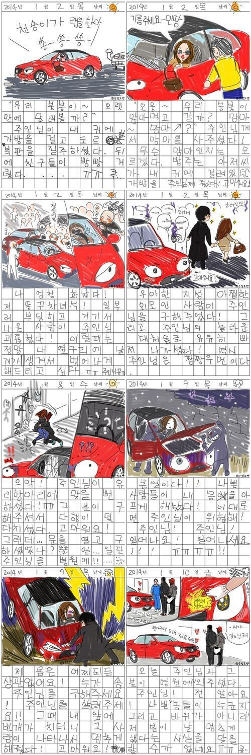 '별그대 붕붕이 일기'에는 '주인님이 내 귀에 가방을 걸고 도로 한복판을 질주하셨다 큭', '주인님께서 맘마를 사주셨다', '우아한 지성 아찔한 외모인 사람이 주인님을 구해주었다' 등의 재치 있는 글이 담겨있어 눈길을 끌었다.