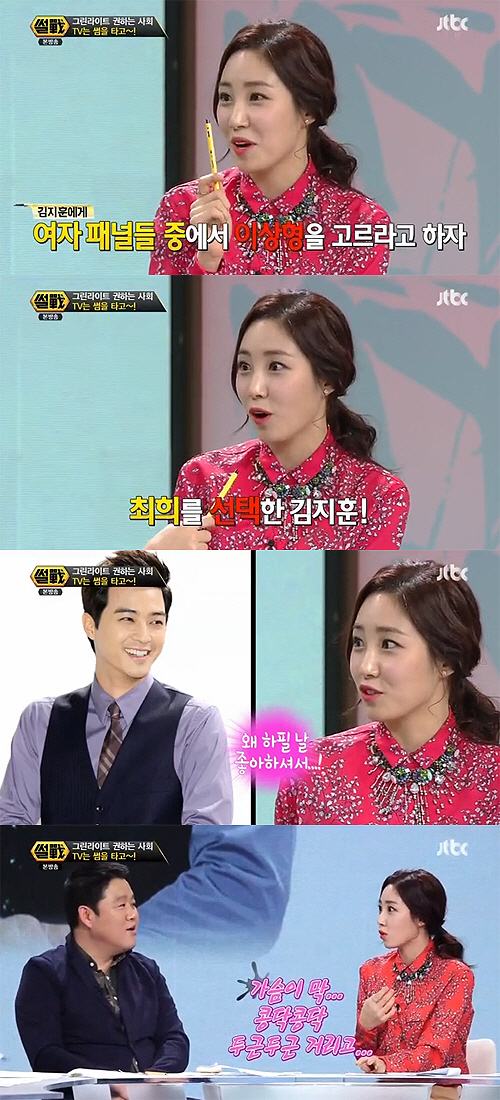 지난 주 온갖 명언을 선보였던 최희는 이번 녹화에서 오프닝부터 대놓고 명언 퍼레이드를 시작, 의욕을 불태웠다. 이어 그는 최근 KBS 설특집 '엄마를 부탁해'에서 MC를 본 박지윤에게 "6년만에 친정 귀환을 축하한다. 레귤러 편성이 꼭 되길 응원한다"며 '썰전' MC 자리 '고정'을 노려 스튜디오를 웃음바다로 만들었다.